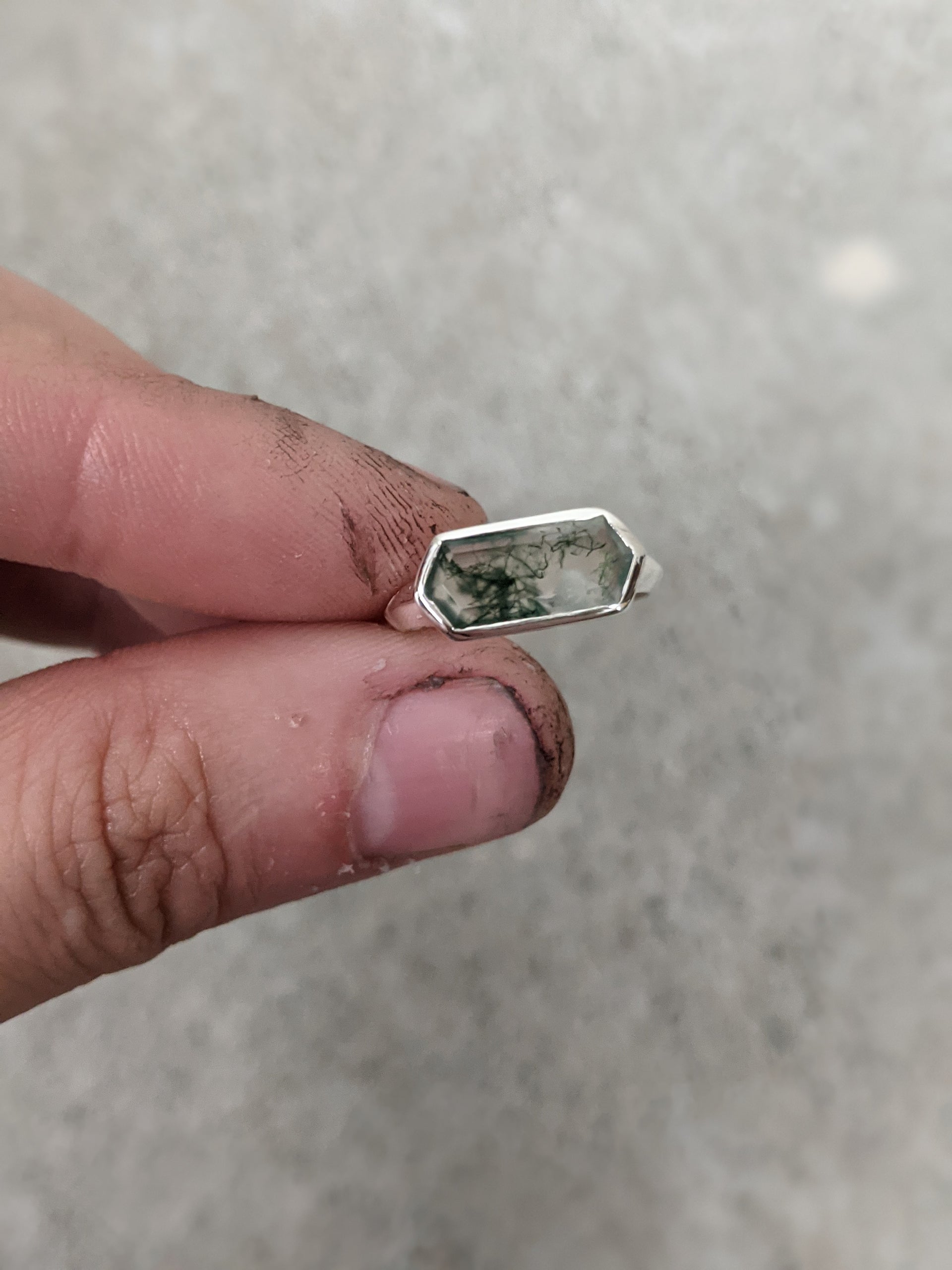 The elongated hexes are about 1/2 an inch long. They are set in bold solid gold open back bezel running east/west along the finger.